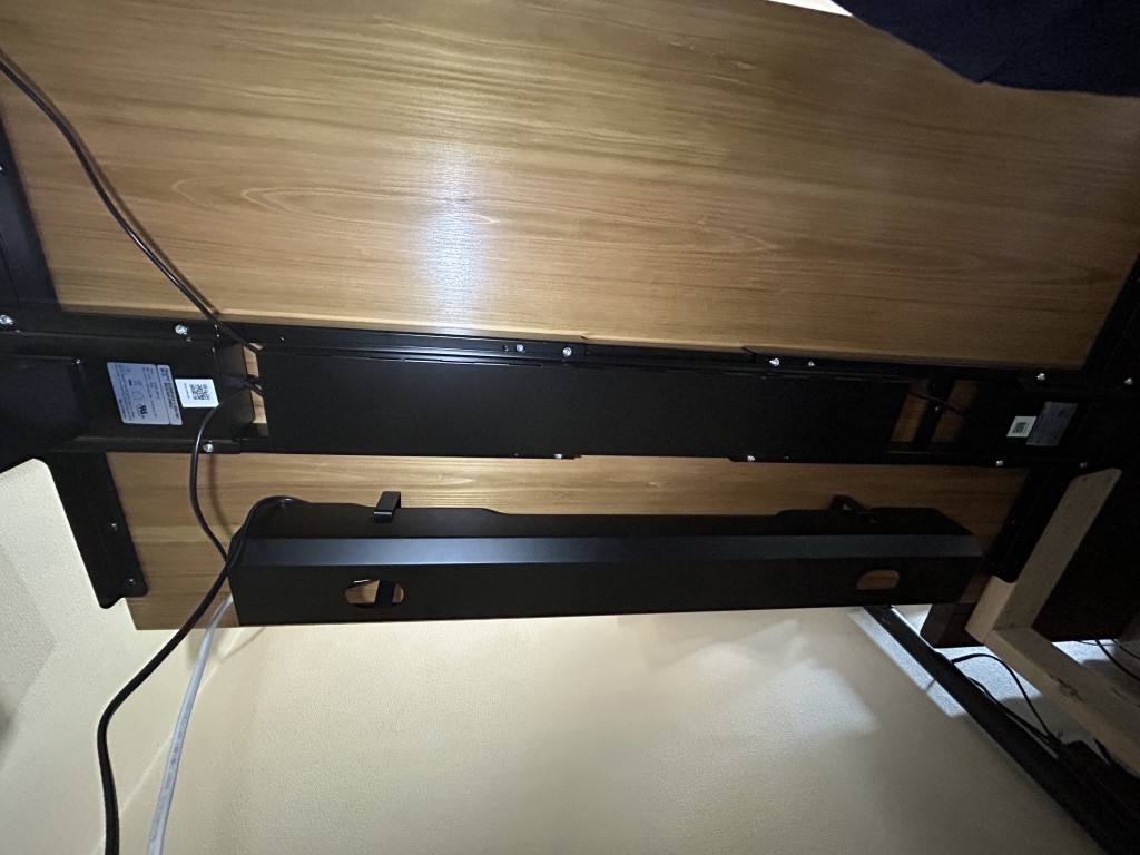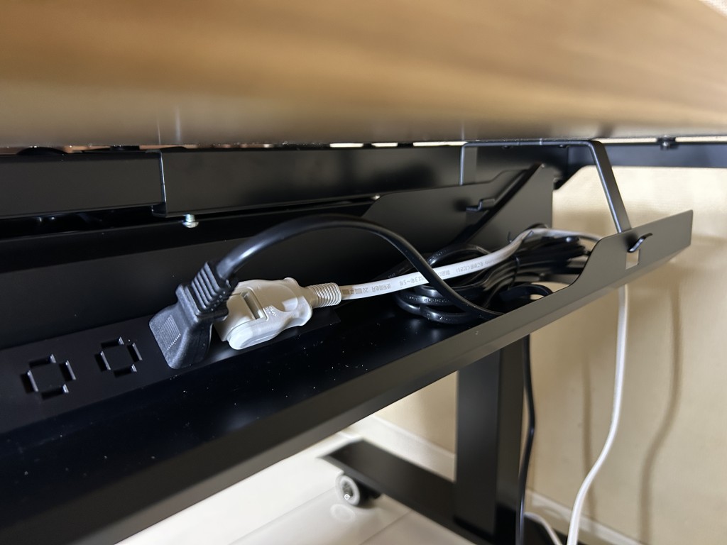 電源タップのコードだけは部屋のコンセントから配線するのでデスクの昇降高さに合わせたコードのゆとりが必要ですね。