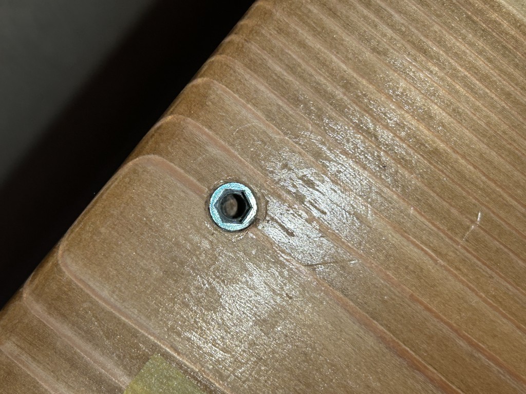 付属の木ねじで直接取り付けても良いし問題ないと思いますが、今回私は鬼目ナットという材料を天板に埋め込んで固定することにしました。